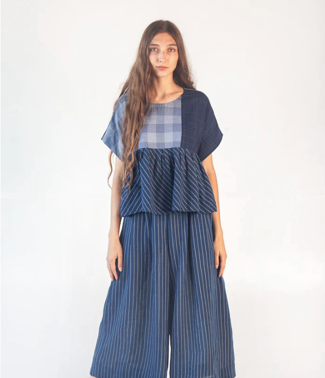 100% handwoven cotton flowy patchwork top with short sleeves and side pockets.