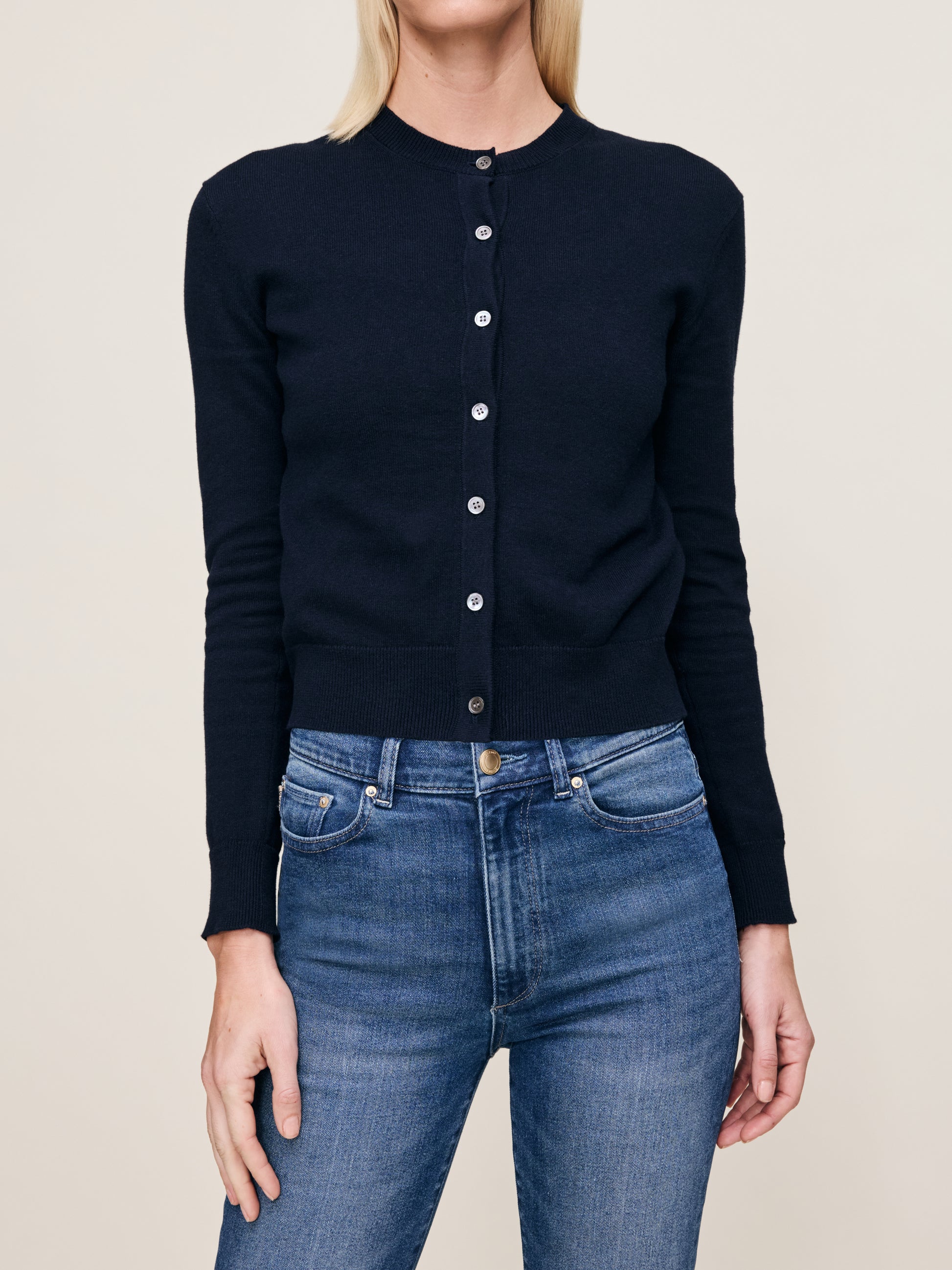 Brinn Cardigan is a slim button front cardigan, designed for versatile wear. Navy is a traditional blue knit. It features clean finishing and tonal stitching.