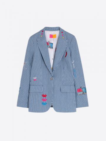 Stretch denim blazer with blue and white stripes, embroidered with snacks designed by Vilagallo on the body and sleeves. Front fastening with metallic star button. Flap pockets. Exclusive Vilagallo printed lining.