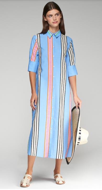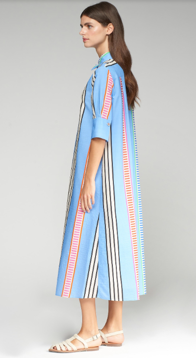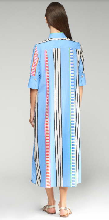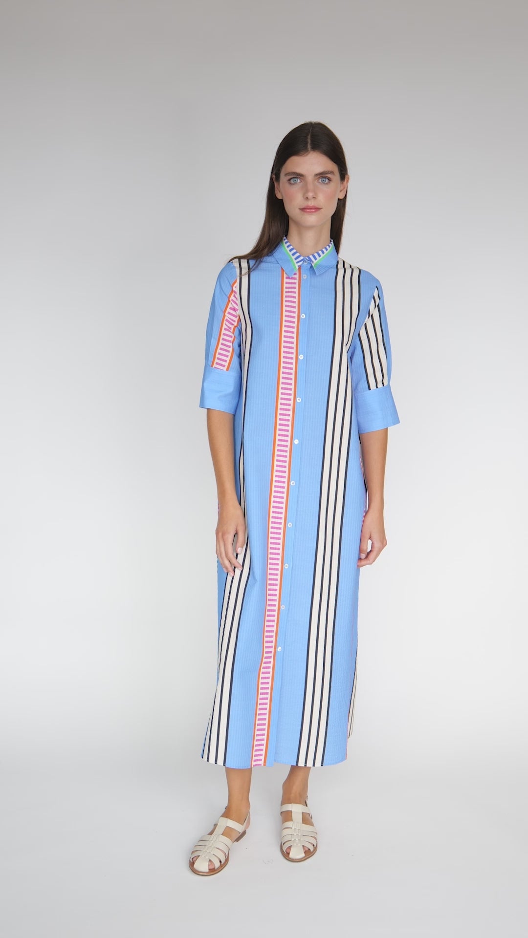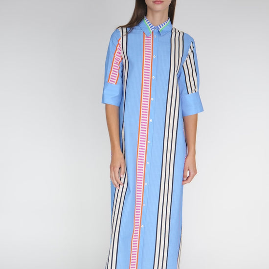 Light blue mido shirt dress with vertical stripes with different designs. Front closure with shirt buttons. Shirt collar. Short sleeve.