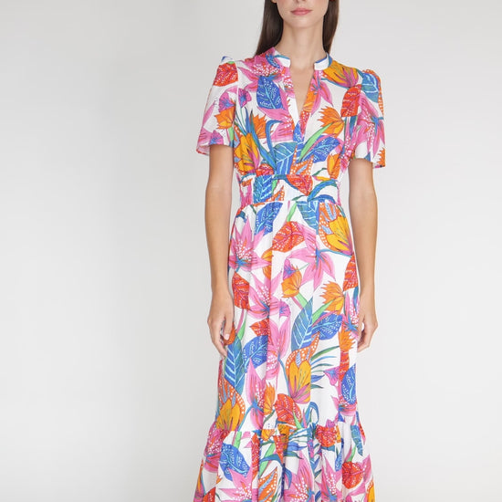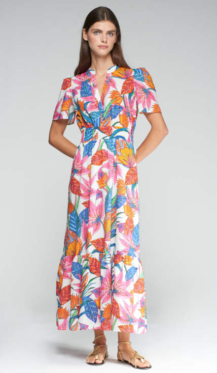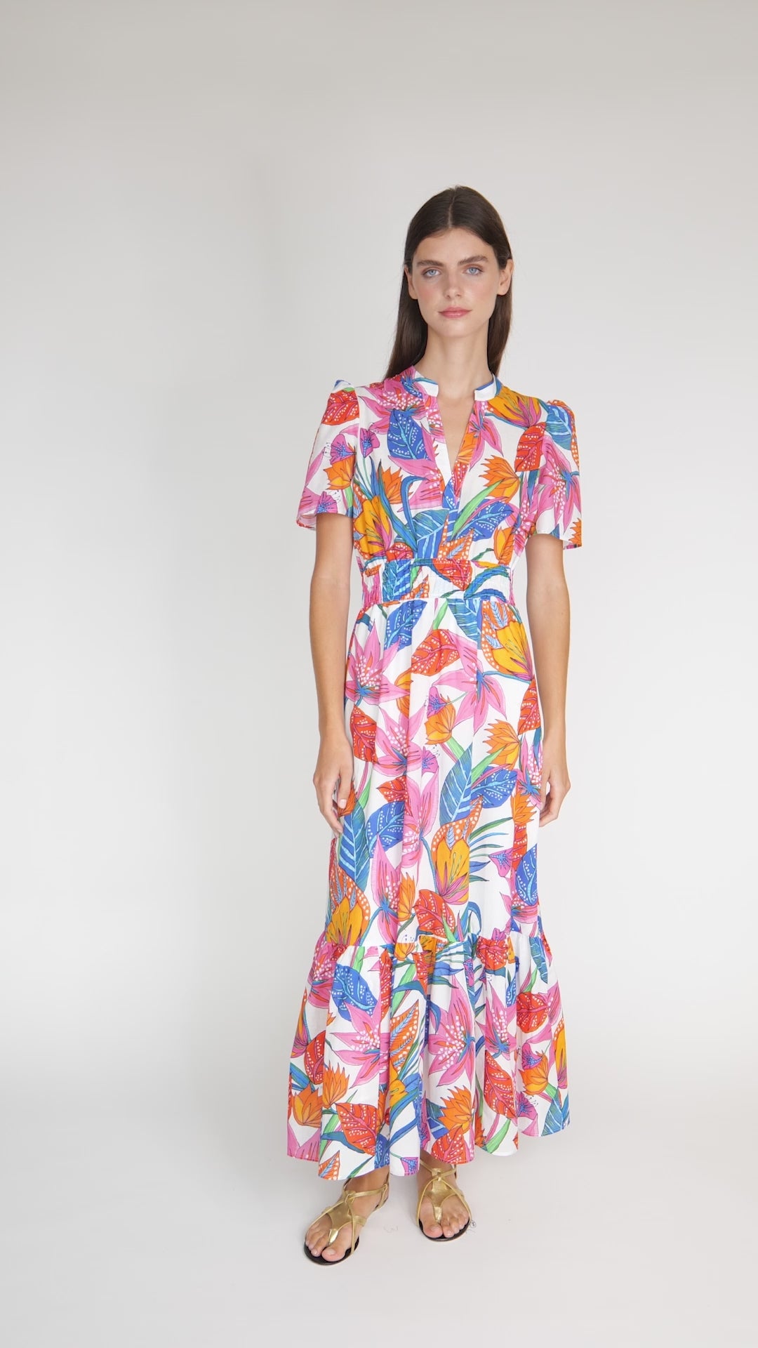 Long dress with tropical flower print in blue, pink and orange. Neckline with V opening. Elastic waist. Short puffed sleeves. 100% cotton.
