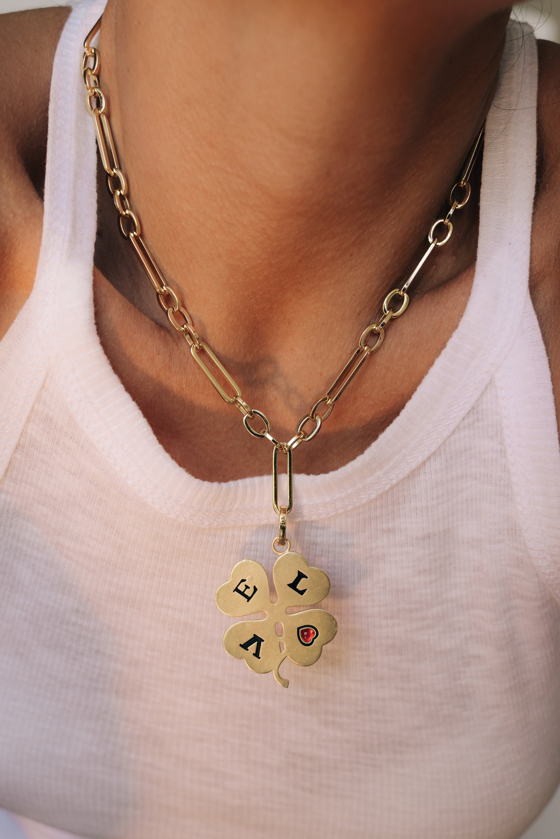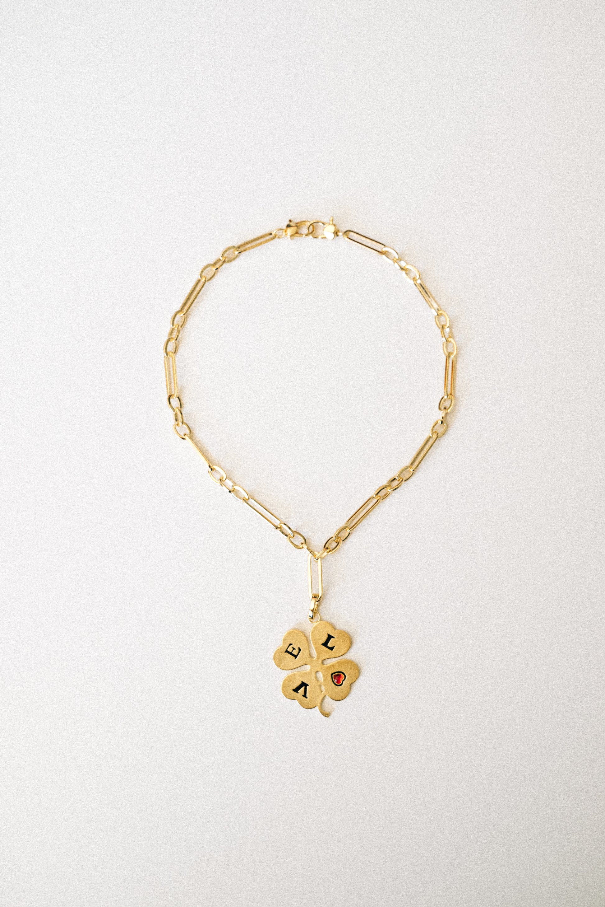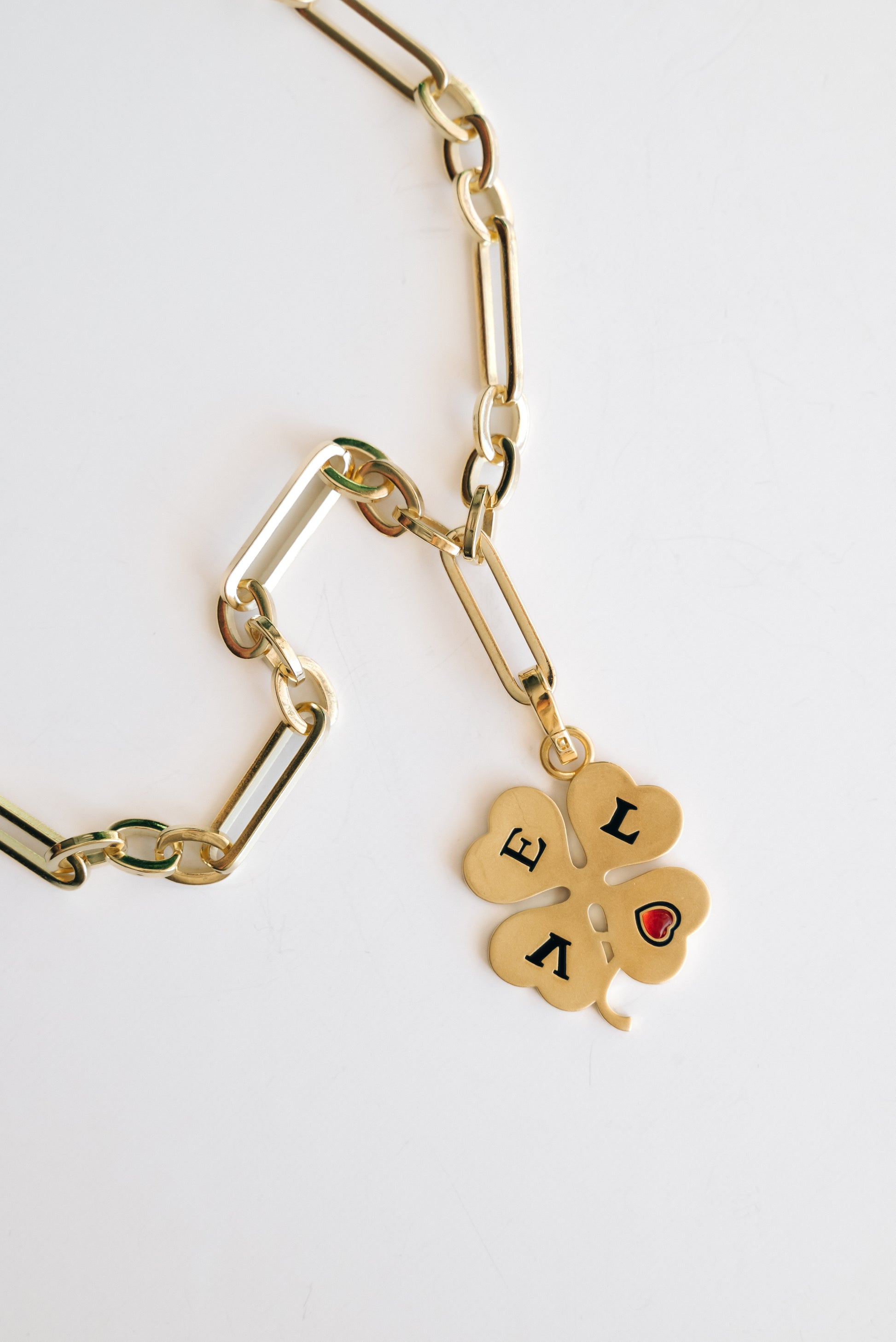 The clover has a hook that allows it to be removed and put on, allowing the chain to be worn alone or with any other charm attached to its ends.