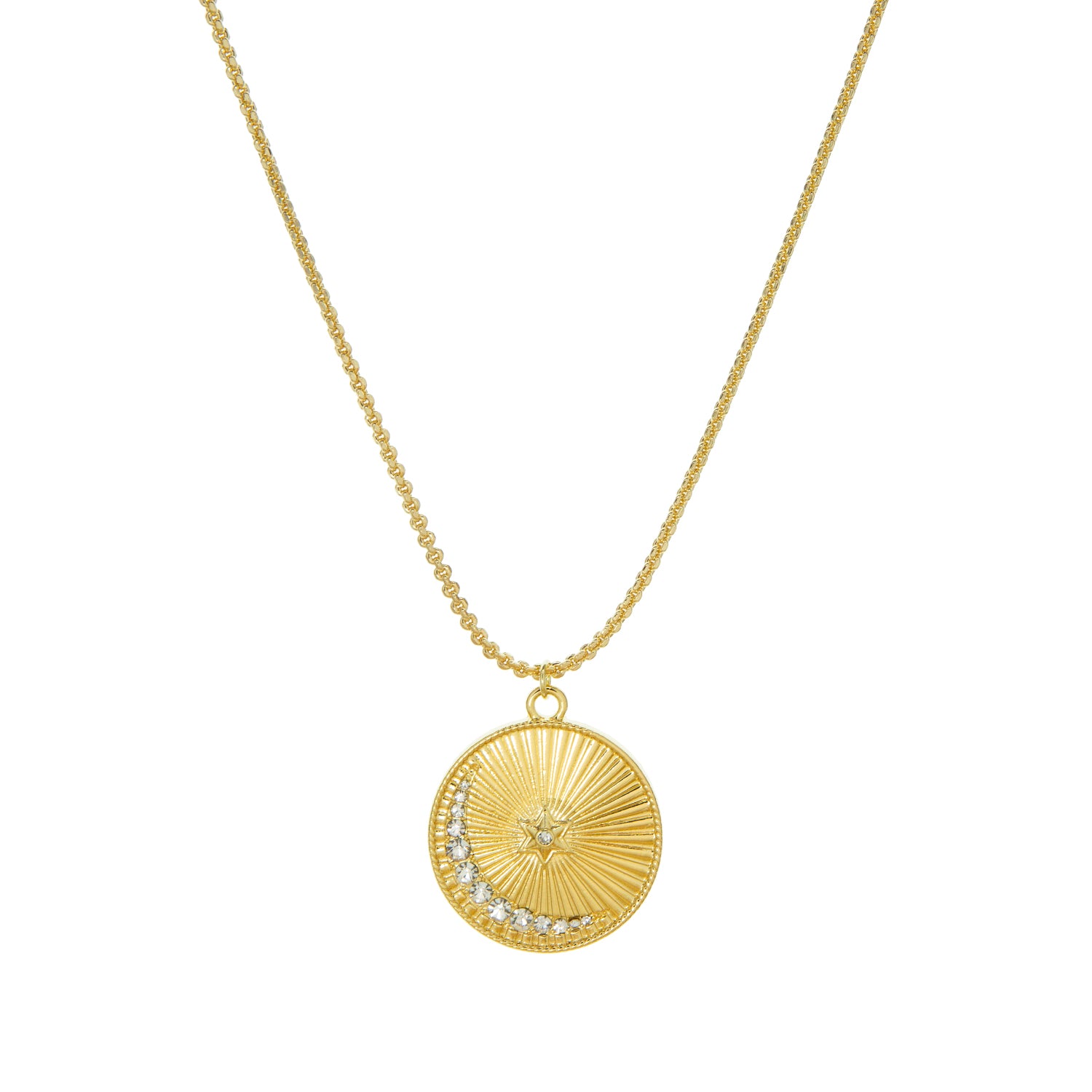 This elegant necklace showcases a sizable moon and star pendant with intricate pave etching, suspended from a 15.5-inch chain with an additional 2-inch extension. The 1.25-inch pendant is crafted from gold-plated brass and features a secure lobster claw clasp for reliable wear.