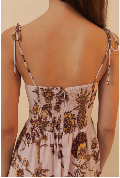 Embrace the exotic allure of the Pink Tropical Landing Lace Midi Dress by FARM Rio. This captivating piece features a sweetheart neckline adorned with delicate lace, while vibrant tropical patterns enliven the soft pink fabric. Adjustable tie straps complete the relaxed silhouette, creating an effortless elegance. Ideal for a sunlit stroll or a dreamy getaway, this dress invites you to savor moments with playful sophistication.