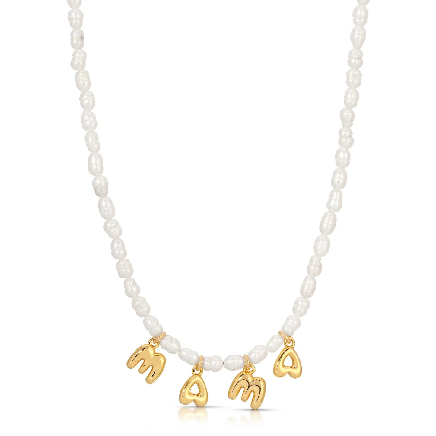 Add some sass to your wardrobe with our newest beaded necklace, showcasing bubble letters M, A, M, & A, spelling out Mama and paired with our Sidekick Pearl.