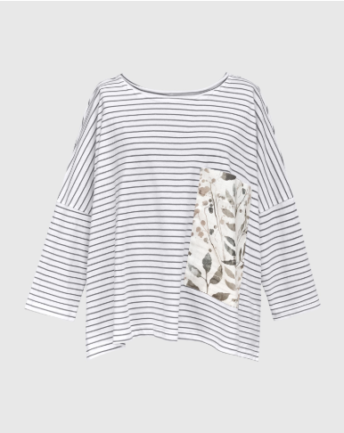 Striped 3/4 Sleeve Shirt with Flower Pocket