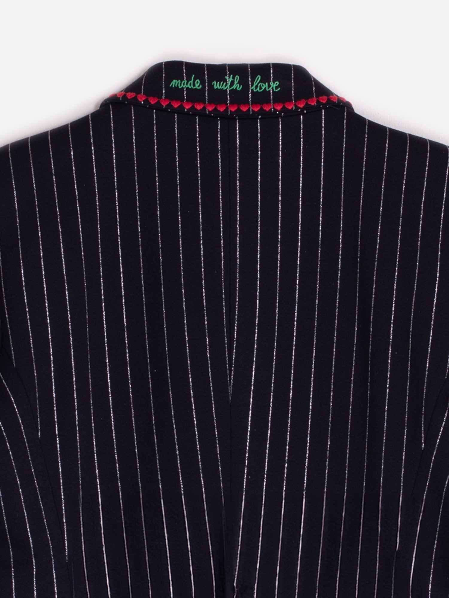 Navy blazer with silver pinstripes, made from a viscose blend fabric. Straight cut with classic lapel and single-button front closure. Features visible patch pockets and decorative red embroidery on the cuffs and collar. Designed as part of a coordinated set with matching trousers.