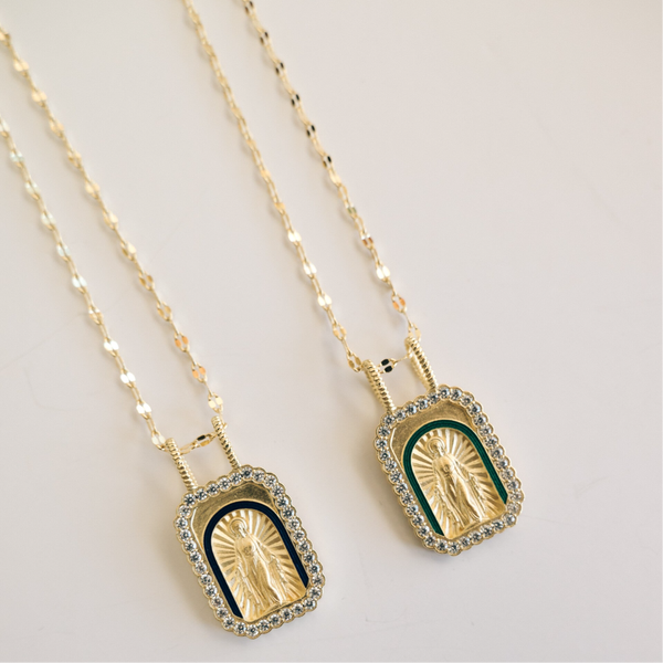 A modern take on the classic Miraculous Medal — delicate, luminous, and full of meaning. This reimagined design brings the Virgin forward in a radiant composition surrounded by sparkling zirconia insets. Each detail is handcrafted with care, making it a little piece of luxury you’ll treasure forever.